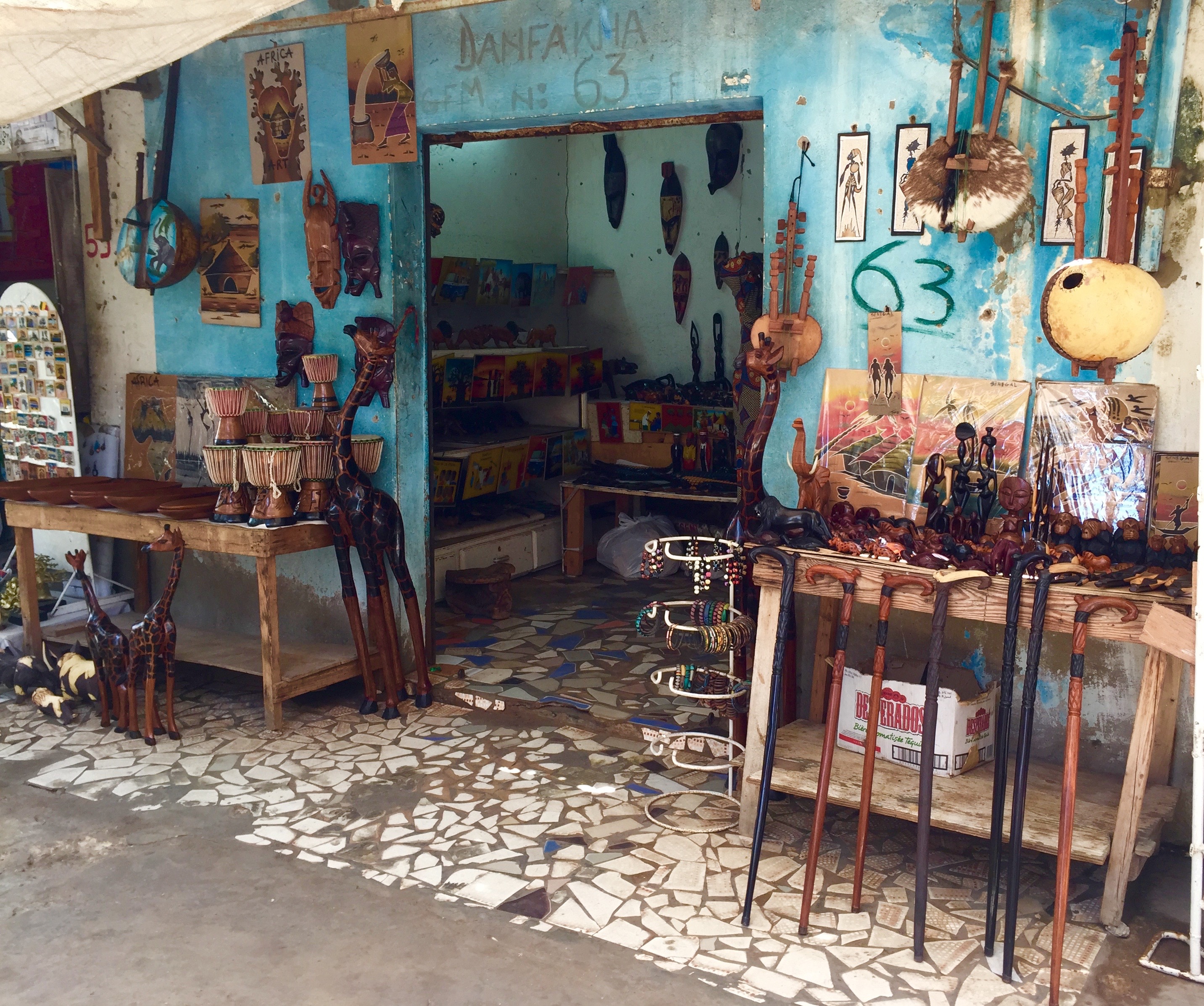 C’est tout l’inverse des grands « shopping mall » à l’occidentale. Ici, il n’y a pas de grandes enseignes de vêtement mondialement connues, ni de marques de joaillerie luxueuses ou encore de maroquinerie en vogue. Les façades extérieures sont vétustes, les fresques murales, peintes par les artistes locaux, défraîchies et les vendeurs sont aussi les artistes. La décrépitude du lieu a son petit charme. C’est un marqueur du temps. Créé en 1961, et inauguré en 1966 à l’occasion du premier festival mondial des arts nègres (FESMAN), il est l’un des symboles historiques de la culture de l’art sur le continent africain.